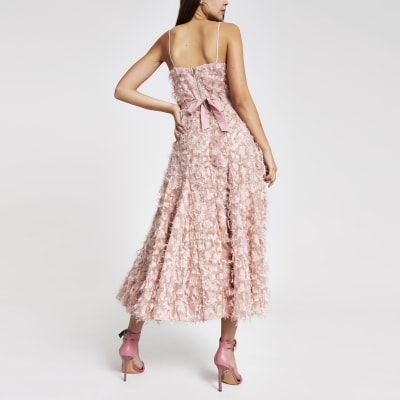 The textured maxi dress is light pink, has spaghetti straps and bow which ties around at the back which makes it super flattering.
