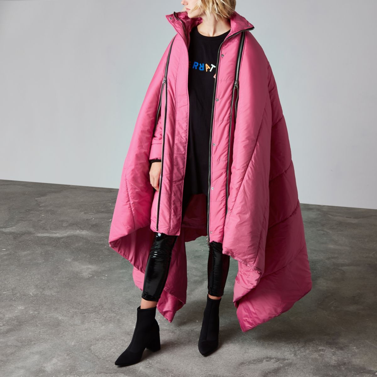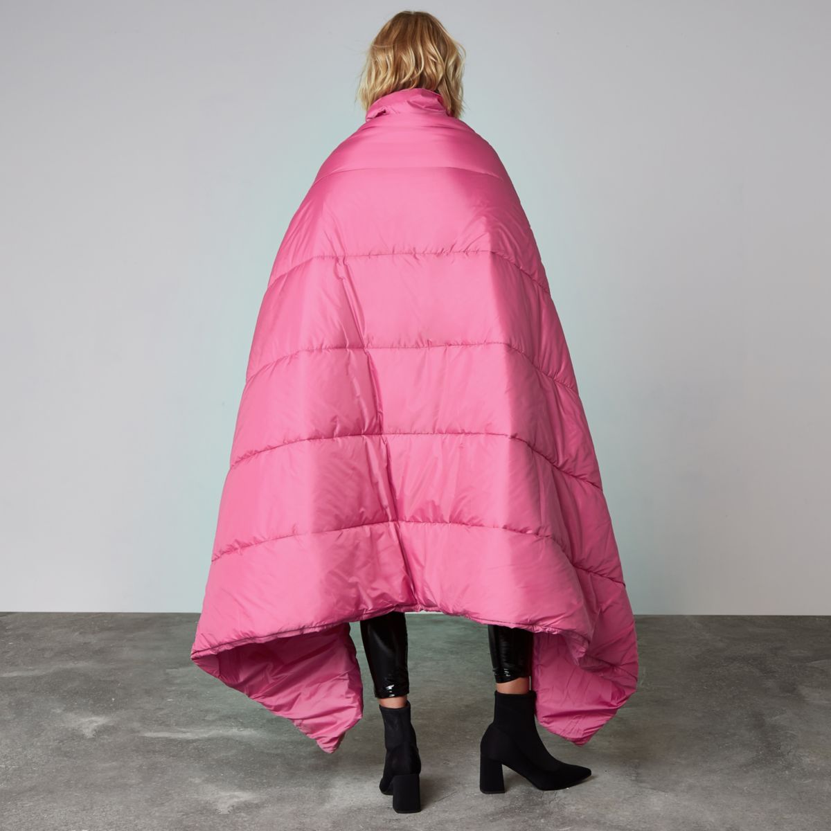 Why? Well, the oversized puffer jacket has double padding inside and a detachable blanket which can be zipped right off. Aka it's a sleeping-bag coat.