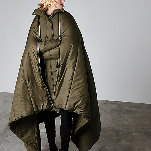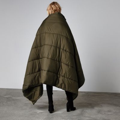 The oversized puffer jacket has double padding inside and a detachable blanket which can be zipped right off.